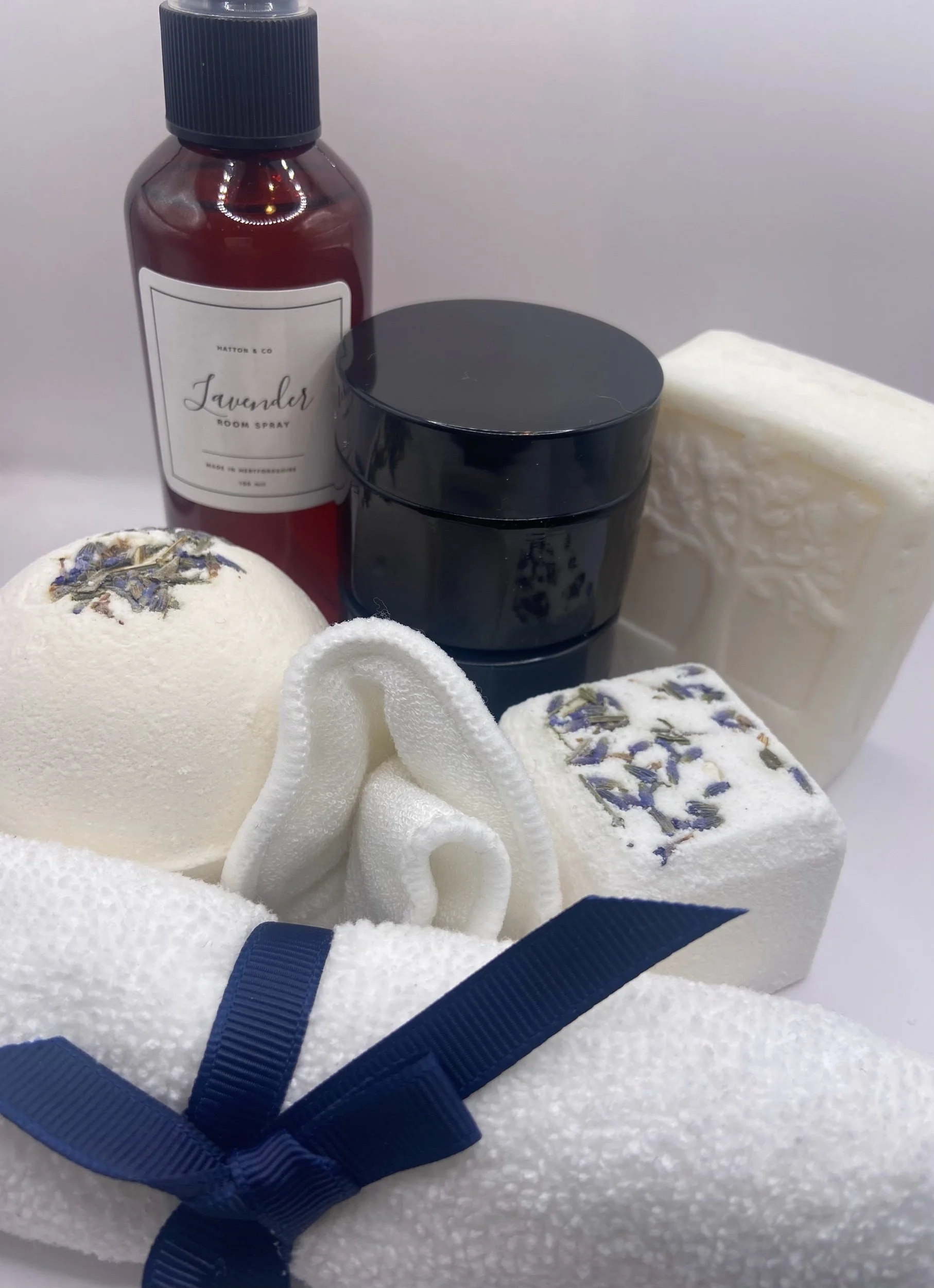Shea Butter, Himalayan Salt, Coconut Oil, Coconut Milk Powder, Lavender, Tea Tree Essential Oil, Pink French Green Clay, Corn Starch, Vitamin E, Baking Soda, Citric Acid, Castor Oil, Lavender Buds, Cream of Tartar.